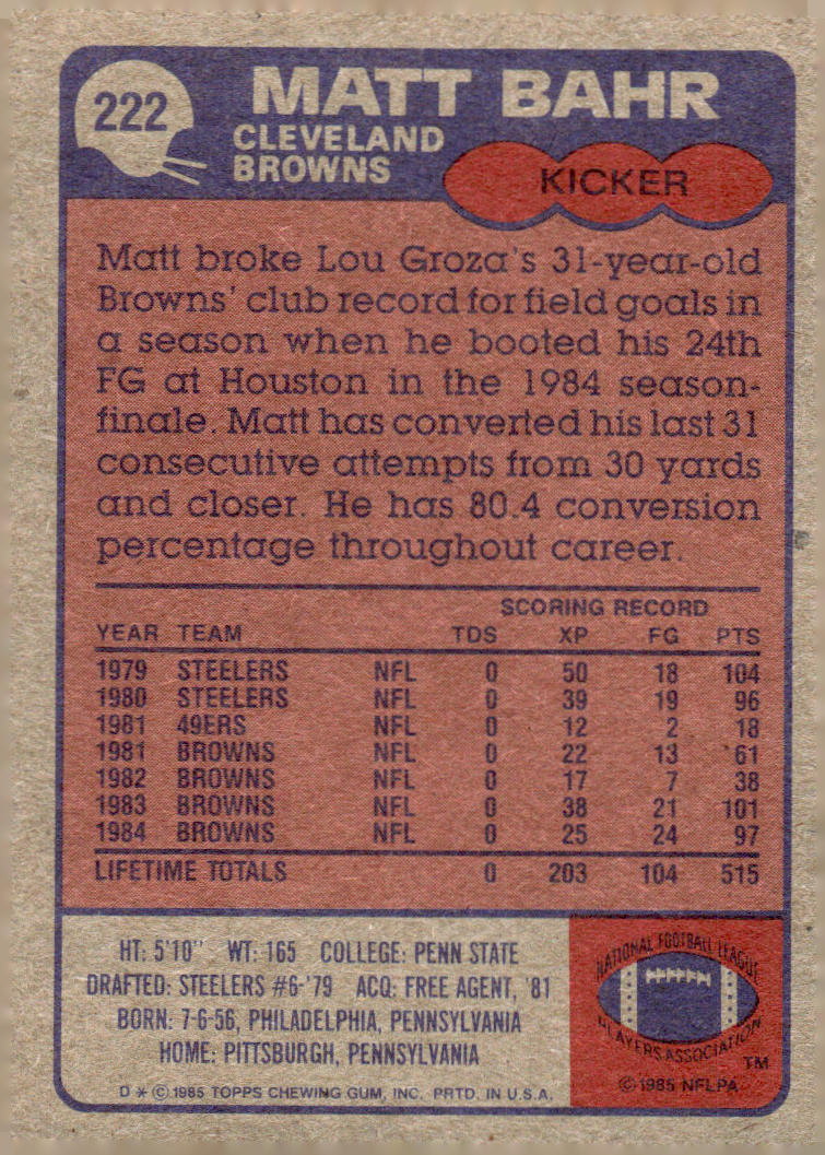 This is a nice example of a 1985 Topps #222 Matt Bahr Other important information about this card:In 1985 Matt Bahr played for the Cleveland Browns.Please check out our other listings for more great cards.