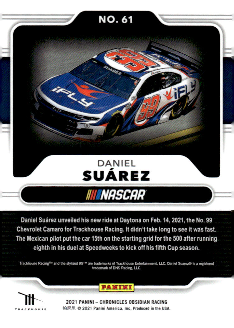 This is a nice example of a 2021 Panini Chronicles #61 Daniel Suarez Obsidian Other important information about this card:In 2021 Daniel Suarez played for the Trackhouse Racing.Please check out our other listings for more great cards.