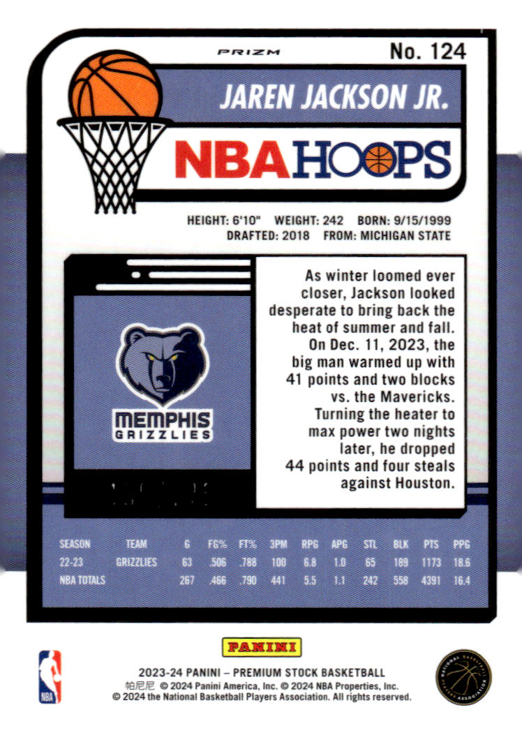 This is a nice example of a 2023-24 Hoops Premium Stock #124 Jaren Jackson Jr. Red Prizm Other important information about this card:SNIn 2023 Jaren Jackson Jr. played for the Memphis Grizzlies.Please check out our other listings for more great cards.